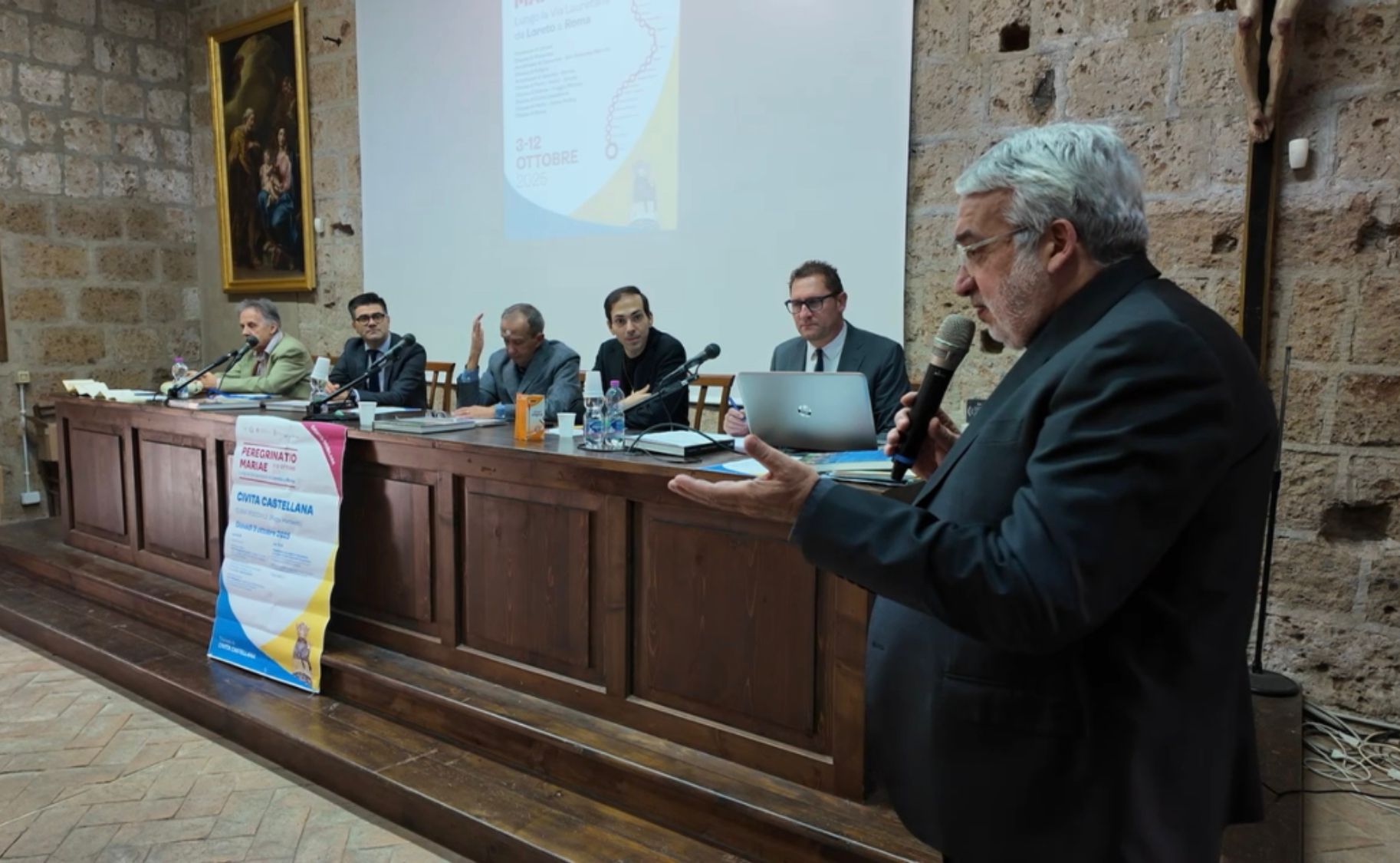 Durante la presentazione si sono alternati gli interventi di Paolo Buonora, membro del Comitato Scientifico del Tavolo di Concertazione per il Recupero e la Valorizzazione della Via Lauretana; Antonio Volpini, curatore della mostra ”Pellegrini di Speranza tra Roma e Loreto: Documenti, cartografia e oggetti di antichi viaggiatori tra XVI e XIX secolo” (fino al 7 gennaio all’Abbadia di Fiastra, nel Maceratese, ndr.); e Simone Longhi, direttore del progetto Cammini Lauretani, nonché rappresentante del team che sta conducendo la statua della Madonna di Loreto fino a Roma per la benedizione del Papa del 12 ottobre.