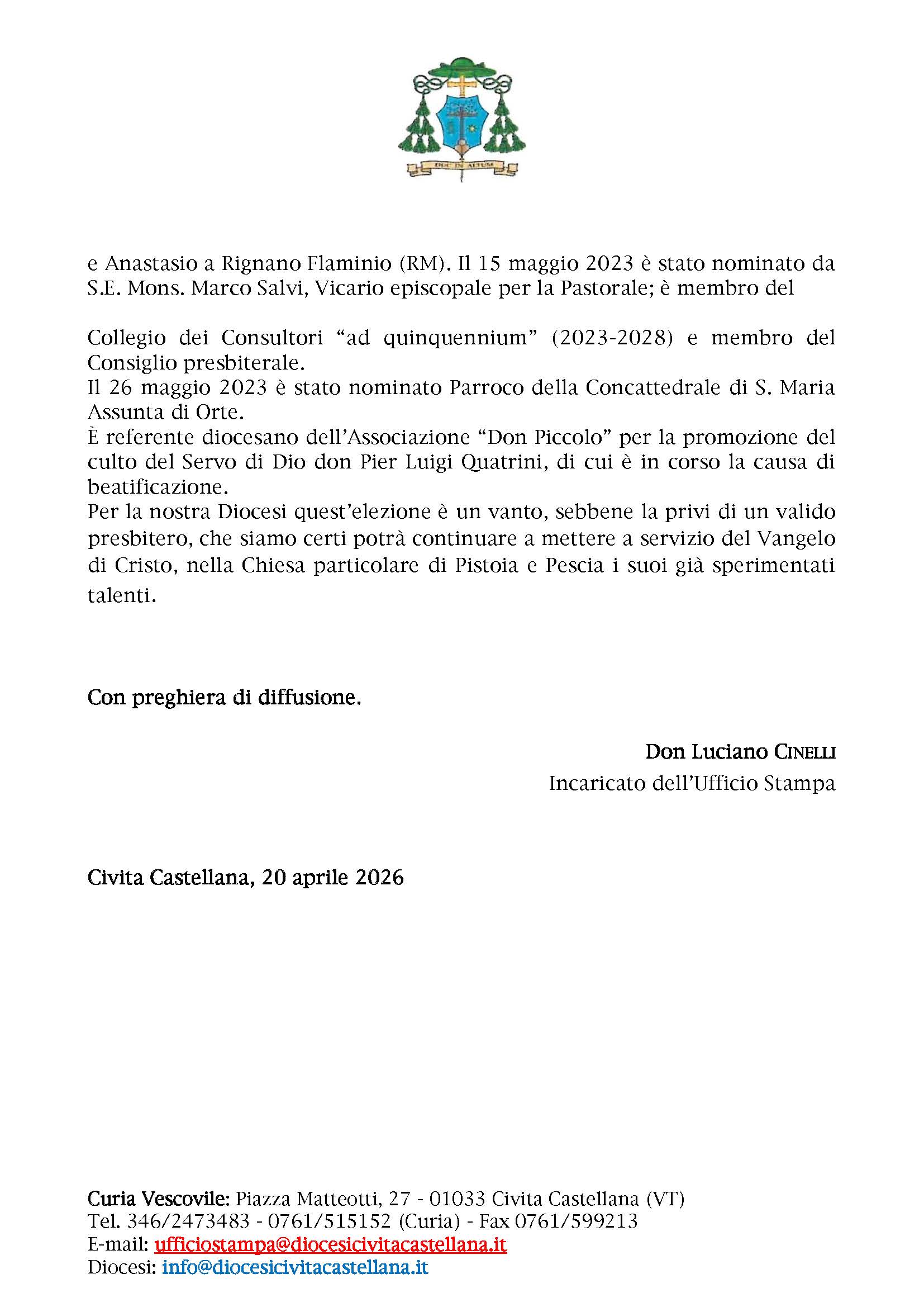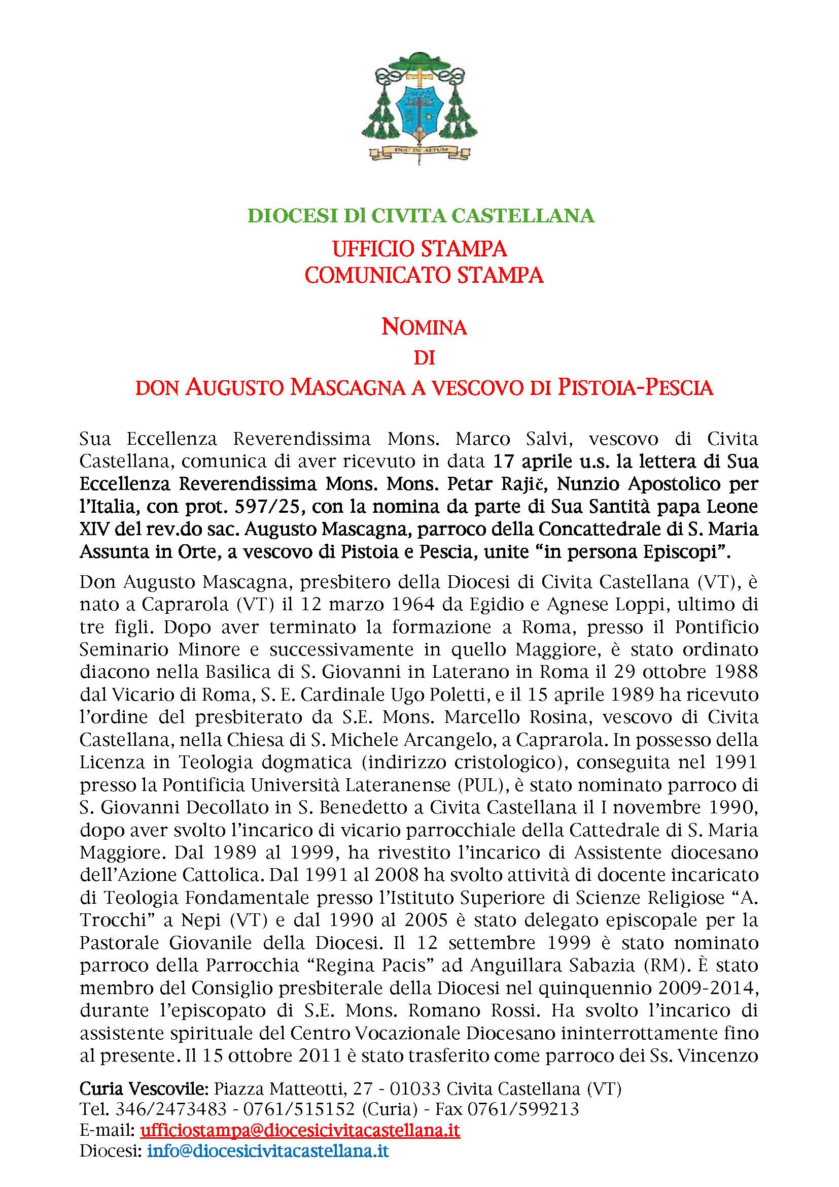 Ufficio Stampa - Nomina di don Augusto Mascagna a Vescovo di Pistoia - Pescia